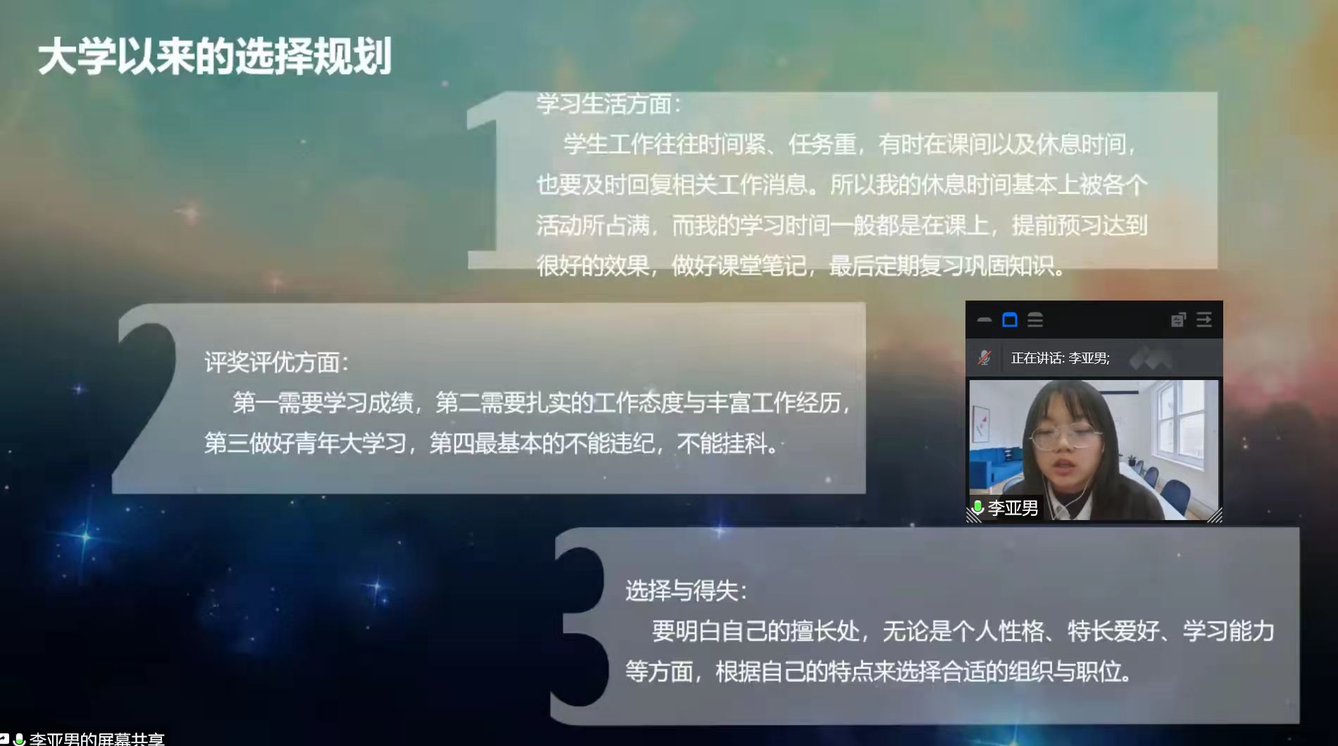 岁月如歌,不知不觉间,2021级yl6809永利集团的同学们,来到大学已经一个月了。为了帮助大家更好的做出老员工活的选择,初步明晰接下来的发展方向,2021年10月23日yl6809永利集团邀请优秀学长学姐为大家召开线上经验交流会。