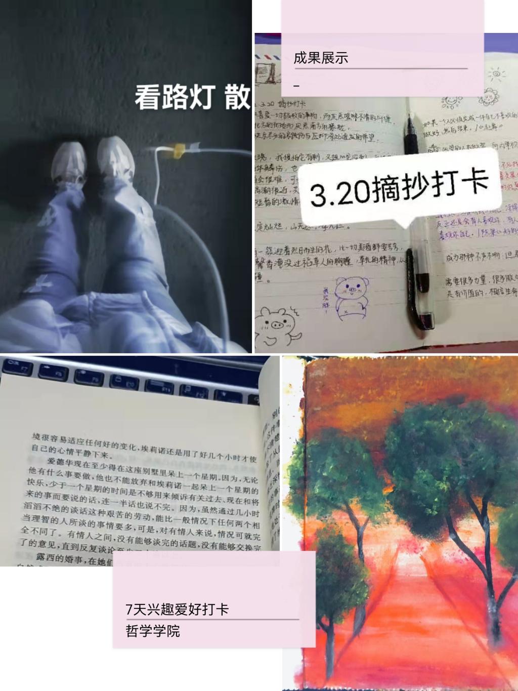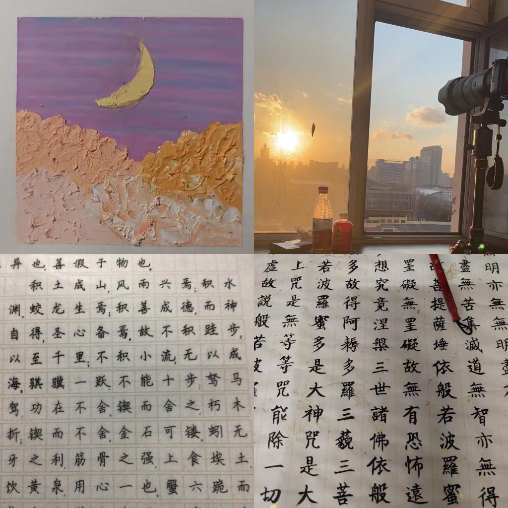 歌喉清婉,淑质英才。同学们在7天内每天坚持发送与自己兴趣爱好有关的视频或图片到群聊里,而这些兴趣活动也大大丰富了同学们的生活,同学们在课余时间大展才华,展现自我,有的同学坚持每天练字,有的用同学坚持每天练琴,有的同学每天作画,在学习之余培养了兴趣爱好,感受到了美育的乐趣!让我们一起来看看同学们的精彩生活吧!