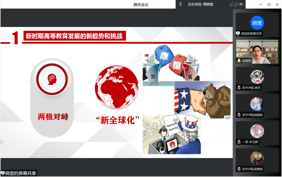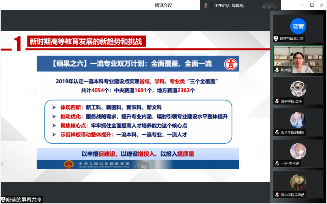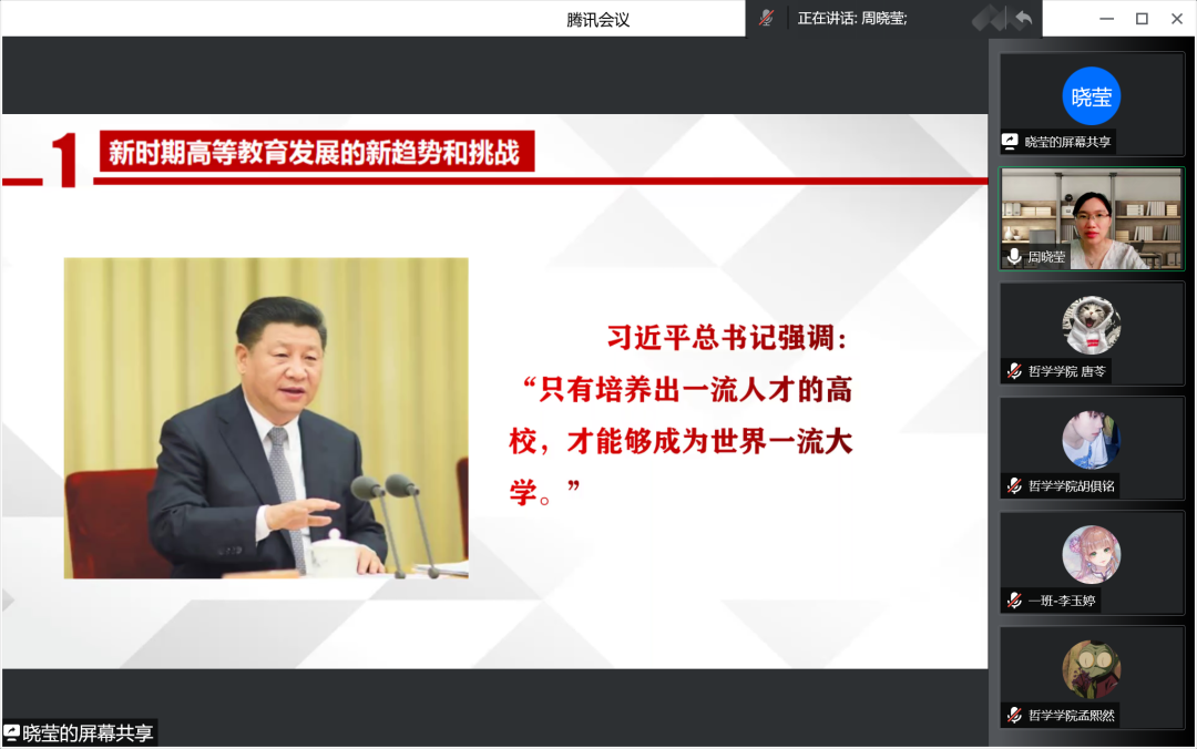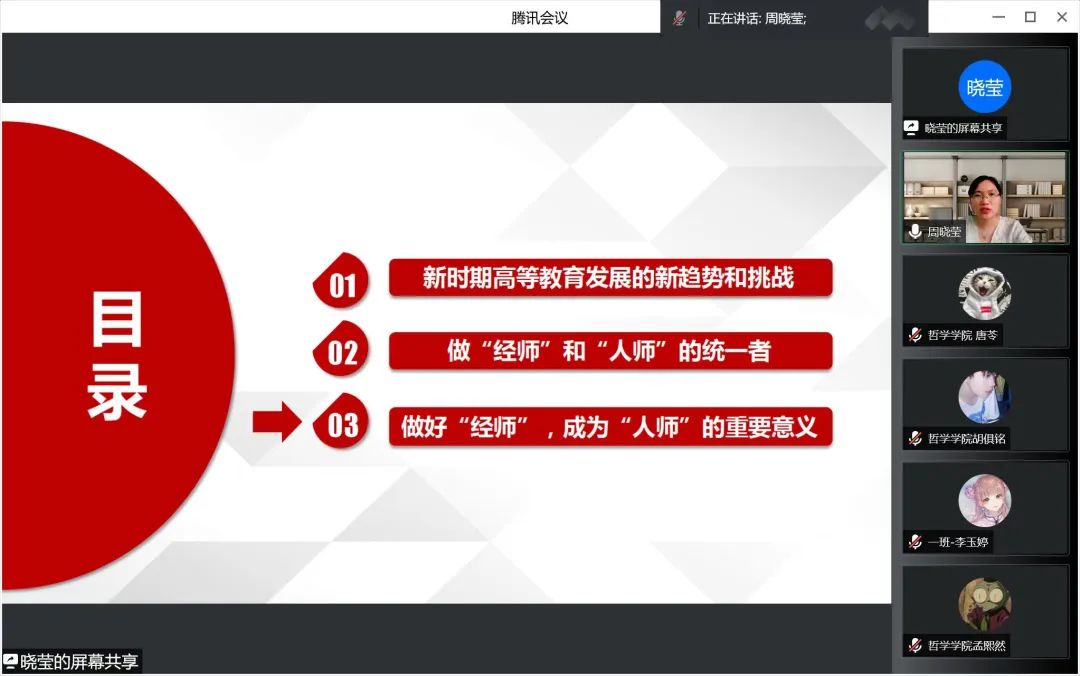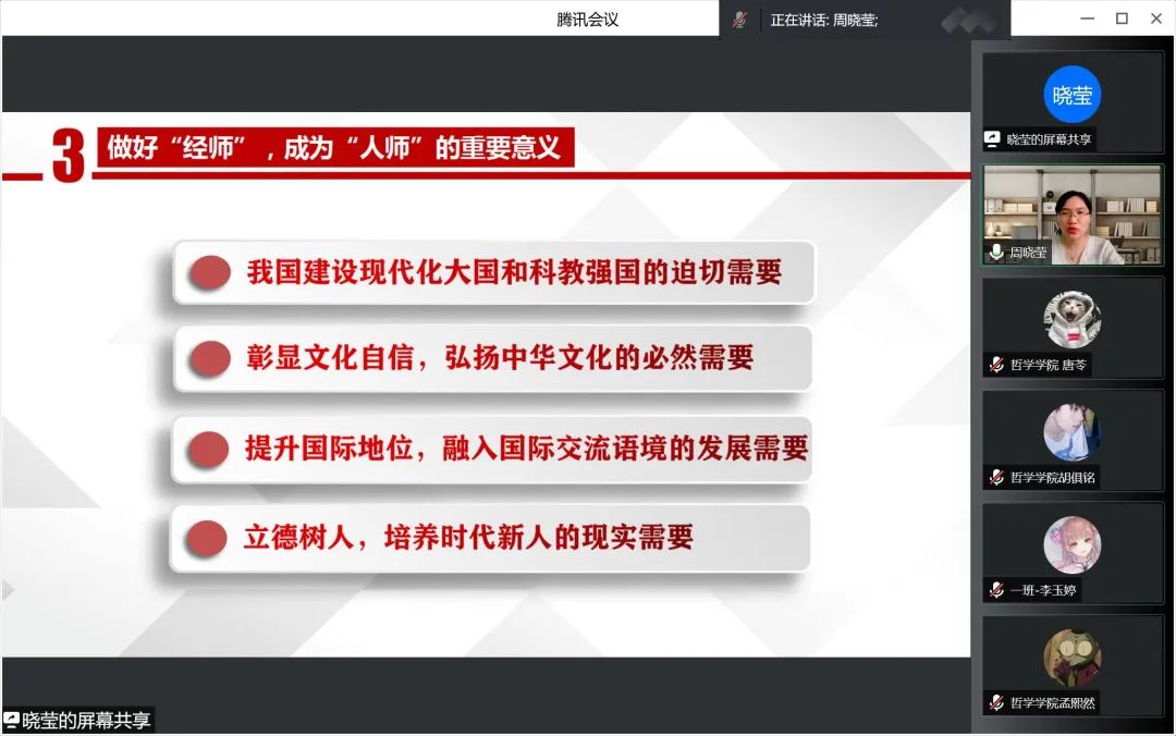 为深入贯彻党的十九届六中全会精神,领悟习近平新时代中国特色社会主义思想,深入解读习近平总书记在中国人民大学考察时的重要讲话精神,yl6809永利集团于2022年6月15日线上开展做好“经师”,成为“人师”——习近平总书记在中国人民大学考察时的重要讲话精神解读讲座,yl6809永利集团周晓莹老师担任此次讲座主讲人,党总支副书记张丽丹老师主持会议,组织员吴红英老师、正处级辅导员孙庆斌老师、团委书记张博伦老师、团委副书记焦瑞老师出席讲座,哲院学院全体党员、预备党员及入党积极分子参加讲座。