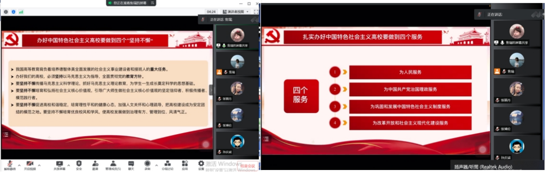 通过学习老师们受益匪浅,纷纷发表讲话。公司党总支副书记张丽丹老师指出,习近平总书记重要讲话具有很强的政治性、思想性和针对性,是指导做好新形势下学校思想政治工作的纲领性文献,从坚定信仰到树立信心,从感染员工到赢得员工,习近平总书记为我们上了一堂特殊而难忘的思政课,我们将牢记党中央的嘱托,努力培养担当民族复兴大任的时代新人,培养德智体美劳全面发展的社会主义建设者和接班人。19级辅导员孙庆斌老师指出,辅导员是思想政治教育工作者的重要组成部分,必须在完成日常工作的基础上,提高政治站位,勇挑工作重担,牢记习近平总书记嘱托,不忘初心、危中寻机,在疫情反复延宕的背景下,推进思想政治工作,完成为党育人、为国育才的使命。20级辅导员张博伦老师表示,要认真学习全国高校思想政治工作会议精神,旗帜鲜明讲政治,深入学习贯彻习近平新时代中国特色社会主义思想,提高政治站位,坚持从讲政治的高度,紧紧地围绕立德树人根本任务,为培养中国特色社会主义事业合格建设者和可靠接班人贡献力量。21级辅导员焦瑞老师表示,作为辅导员,要肩负立德树人使命,加强政治站位,做到“三因”和遵循“三个规律”,同时,引导员工做到“四个认识”,为培养德智体美劳全面发展的社会主义建设者和接班人 贡献力量。