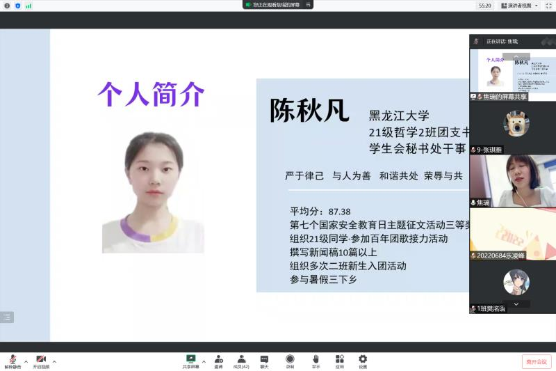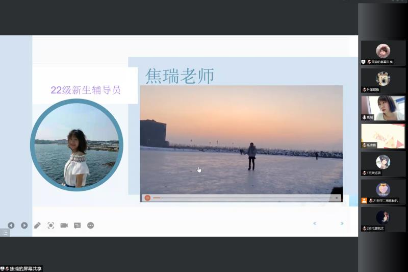 会议伊始,焦瑞老师通过一段视频进行了简单的自我介绍,焦老师强调自己做事的宗旨:在什么阶段、在什么岗位,都要做好自己本职的事。焦老师表示她正是因为对员工的热爱才坚定地选择了辅导员这个职业,她也希望通过对自己求学经历,用自己的所学所感来帮助各位新生在未来的四年里,少走弯路,共同成长。希望各位同学在四年后回望自己的老员工活时没有遗憾。接下来各位员工班主任和2022级新生依次进行自我介绍。