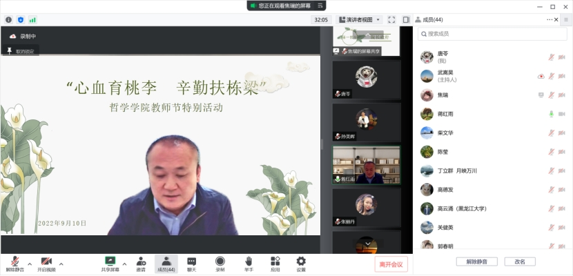 三尺讲台写春秋,一片丹心育桃李。在第38个教师节暨中秋节即将来临之际,为弘扬尊师重教的传统美德,表达对教育工作者的诚挚敬意与谢意。2022年9月7日,哲学公司通过腾讯会议线上开展了“心血育桃李 辛勤扶栋梁”教师节主题活动,yl6809永利集团全体教职工共同欢度佳节。党总支书记孙美晖主持活动。