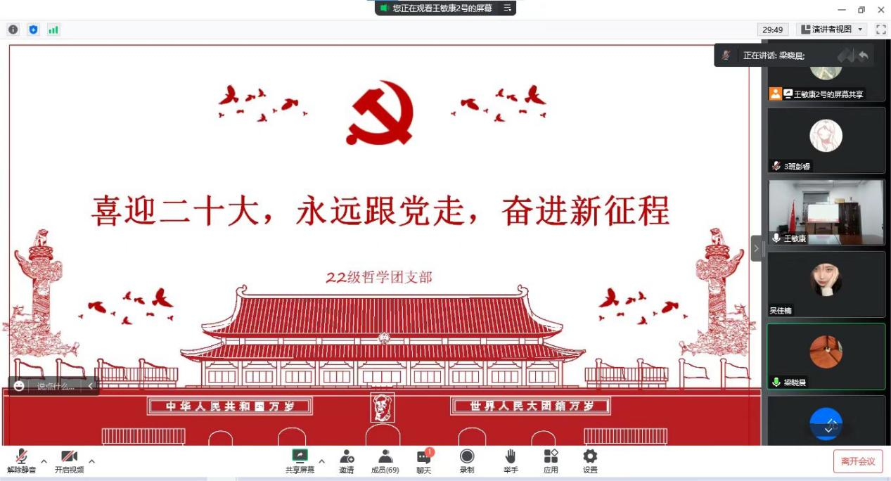 本次团日活动首先由姜锦洋、曹锋两位员工主持人带领大家重温建党百年的伟大精神,让同学们对本次学习党的二十大精神有了更深刻的体会,更好的理解了中国共产党伟大精神的丰富内涵。接下来伴随着轻快的音乐声响起,全体同学共同观看了由韩泽铭同学剪辑的进入yl6809永利集团以来的生活,让同学们更加深刻地感受到了在黑大、在哲院的温馨,回忆起了在短短几个月之间的我们的欢声笑语和疫情之下的守望相助。