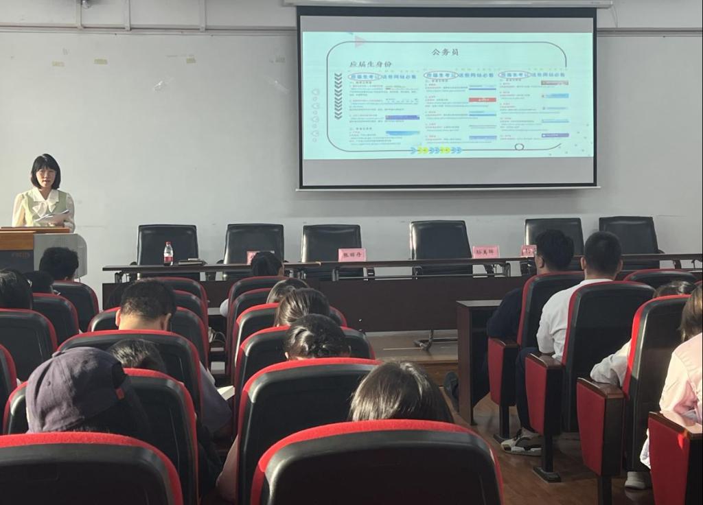 焦老师指出大三是明确方向、梦想启航的关键一年,2021级辅导员焦老师从就业方向进行指导,并从各个就业方向如何获取信息、需要具备的基本条件进行讲解。保研方面,讲解了往届保研的类别、推荐标准与实施细则;考研方面,强调要做到信息对称和找准定位,并介绍了要大量搜索信息、搜索学校、考试大纲、报录比、历年真题,精准定位适合自己的专业;基层项目方面,讲解了非定向选调生、三支一扶、特岗教师的招聘流程、基本条件;公务员报考方面,提醒同学们抓住应届生身份,介绍了各省报考网站;协议就业方面,介绍了常用的获取就业信息渠道、线下线上平台。