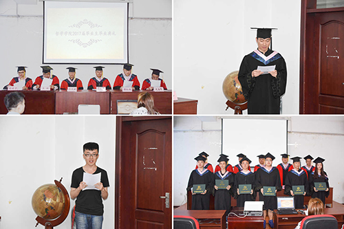 本次典礼以一段温馨感人的视频开场,视频记录了大学四年里的点点滴滴,有友情、爱情,还有师生情,在场的人无不为之感动。随后,全体师生起立,唱国歌,场面庄严肃穆。王秋老师向大家宣读了毕业资格审查报告及学位审批报告后,孙庆斌书记对获得优秀毕业生荣誉称号的同学进行表彰,并鼓励毕业生要以其为榜样修身立德、博学致远。蒋红雨老师宣读了表彰考取硕士研究生同学的决定,希望他们能够再接再厉,取得更优异的成绩。接下来,学院领导及教师代表为全体毕业生颁发了毕业证书,每个人拿到毕业证书后都无比激动,这个证书不仅意味着他们圆满的完成了大学本科四年的学业,也预示着他们即将离开母校,奔向更远的目标。