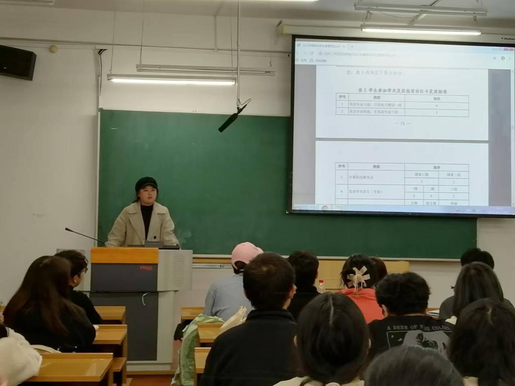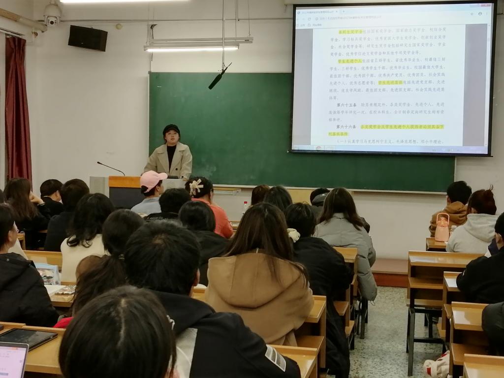关于奖优评定、综合测评等方面,赵老师向员工介绍了学校的奖励标准、评选办法等规定,强调同学们应注重自身全面发展,鼓励大家多参加各类比赛、多参与社会实践,在实践中增长才干。