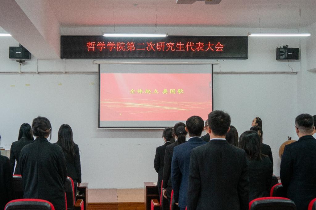 会议伊始,全体起立,奏唱国歌。