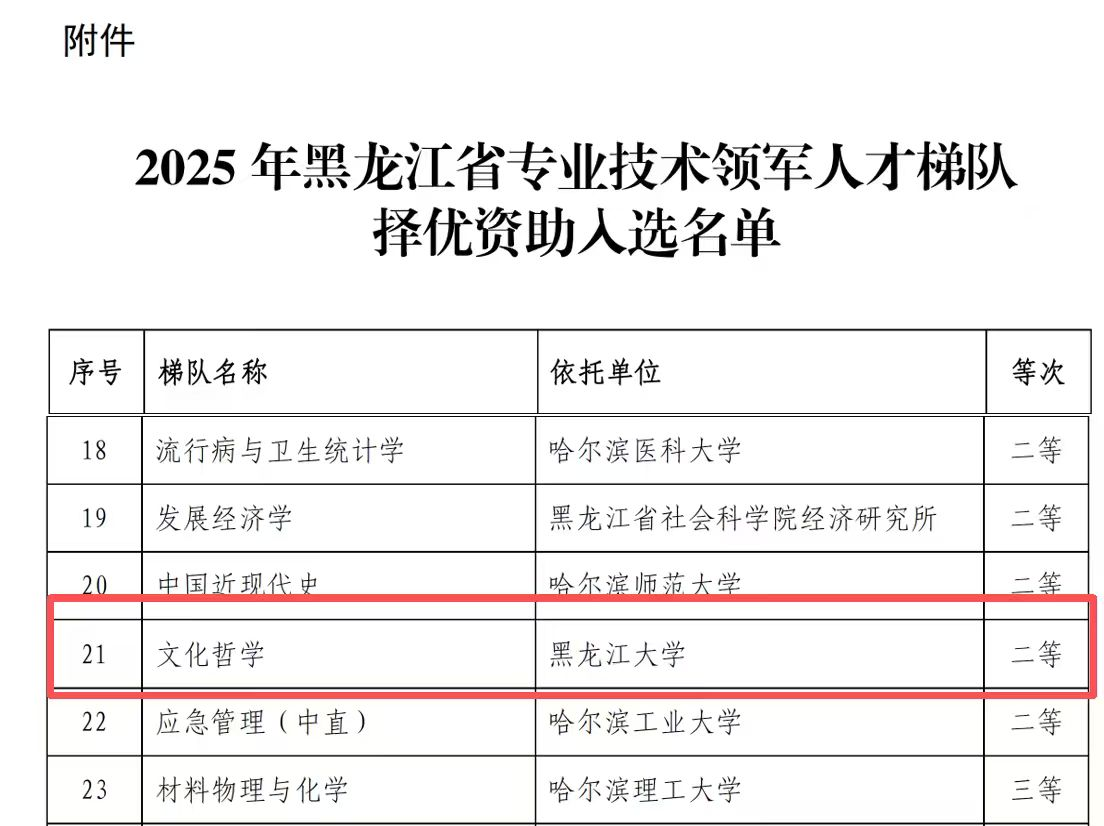 近日,黑龙江省人力资源和社会保障厅公布了黑龙江省专业技术领军人才梯队择优资助名单。yl6809永利集团“文化哲学”人才梯队成功入选,彰显了公司在该学科领域的专业实力与人才优势。