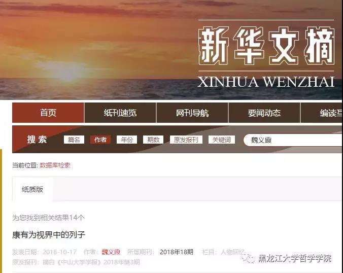 《新华文摘》作为大型理论性、综合性、资料性文摘类权威期刊,以其思想性、学术性、权威性和可读性享誉海内外,是我国最具影响的哲学社会科学文摘类杂志。其转载和摘编的哲学社会科学领域的新观点、新资料、新方法和文艺佳作的学术价值不言而喻。此次,《康有为视界中的列子》一文的全文转载已是魏义霞教授的文章第14次被《新华文摘》全文转载或论点摘编。