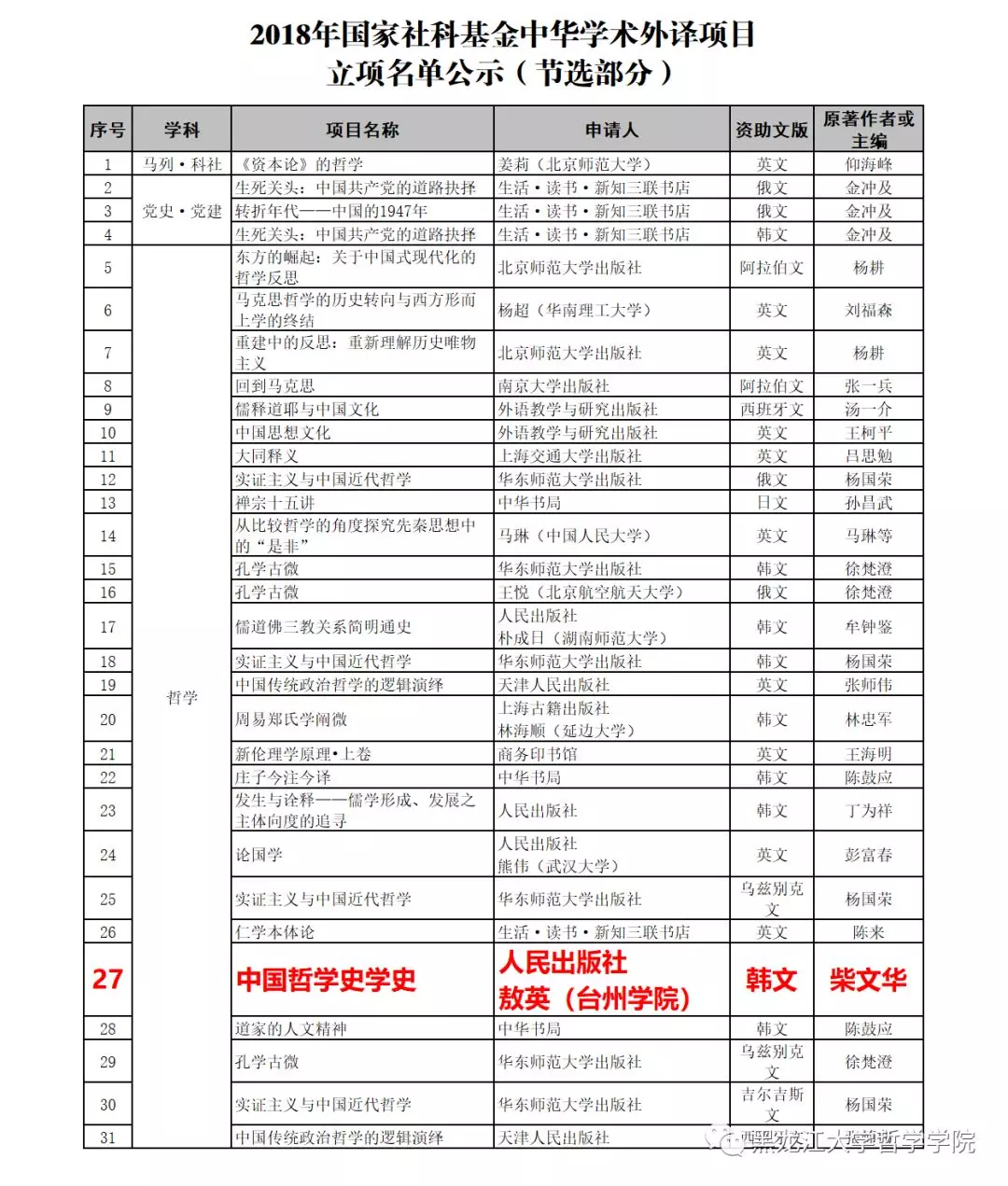 此前,柴文华教授编著的《中国哲学史学史》获批为2018年国家社科基金中华学术外译项目资助,资助文本为韩文。中华学术外译项目是国家社科基金项目的主要类别之一,主要资助代表中国学术水准、体现中华文化精髓、反映中国学术前沿的学术精品,以外文形式在国外权威出版机构出版并进入国外主流发行传播渠道,旨在深化中外学术交流与对话,增进世界了解中国和中国学术,增强中国学术国际影响力和国际话语权,不断提升国家文化软实力。