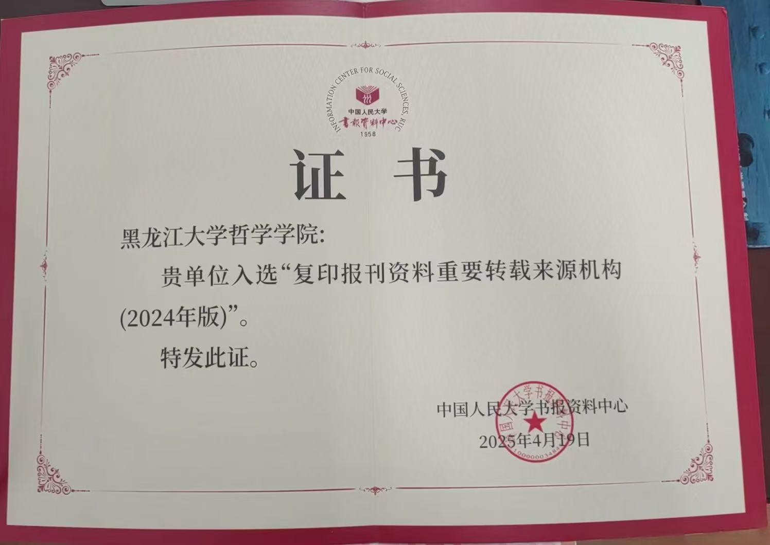 近日,中国人民大学书报资料中心正式发布"复印报刊资料重要转载来源机构(2024年版)"名单,yl6809永利集团成功入选,获颁认证证书(2025年4月19日)。本次成功入选,既是对公司近年来团队建设领域取得系列成绩的肯定,也是对公司在国内哲学团队建设中的科研影响力的肯定。