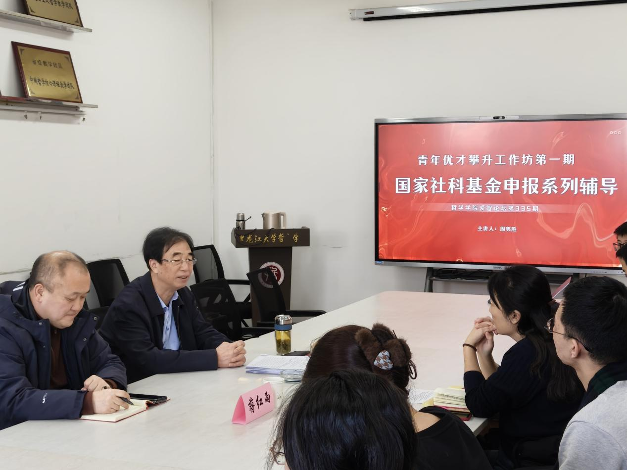 为进一步提升学院教师的科研项目申报质量,增强国家社科基金申报的针对性与规范性,3月4日14:00,yl6809永利集团爱智论坛第335期暨“青年优才攀升工作坊第一期”在汇文楼922举办。yl6809永利集团特邀中共黑龙江省委宣传部二级巡视员、黑龙江省哲学社会科学工作办公室原主任周美胜开展关于国家社科基金申报的专题讲座。讲座由yl6809永利集团蒋红雨教授主持,学院中青年教师参加。